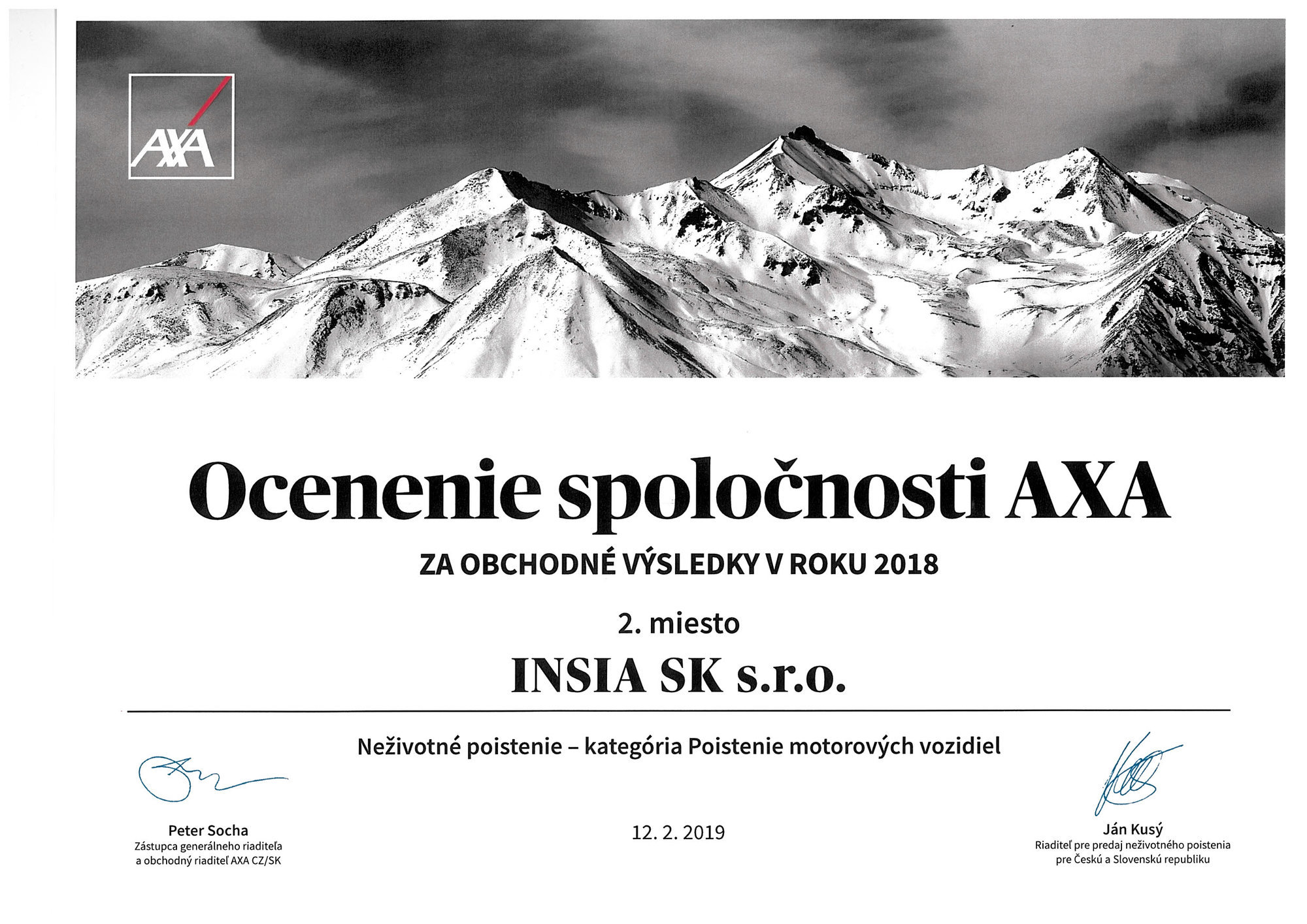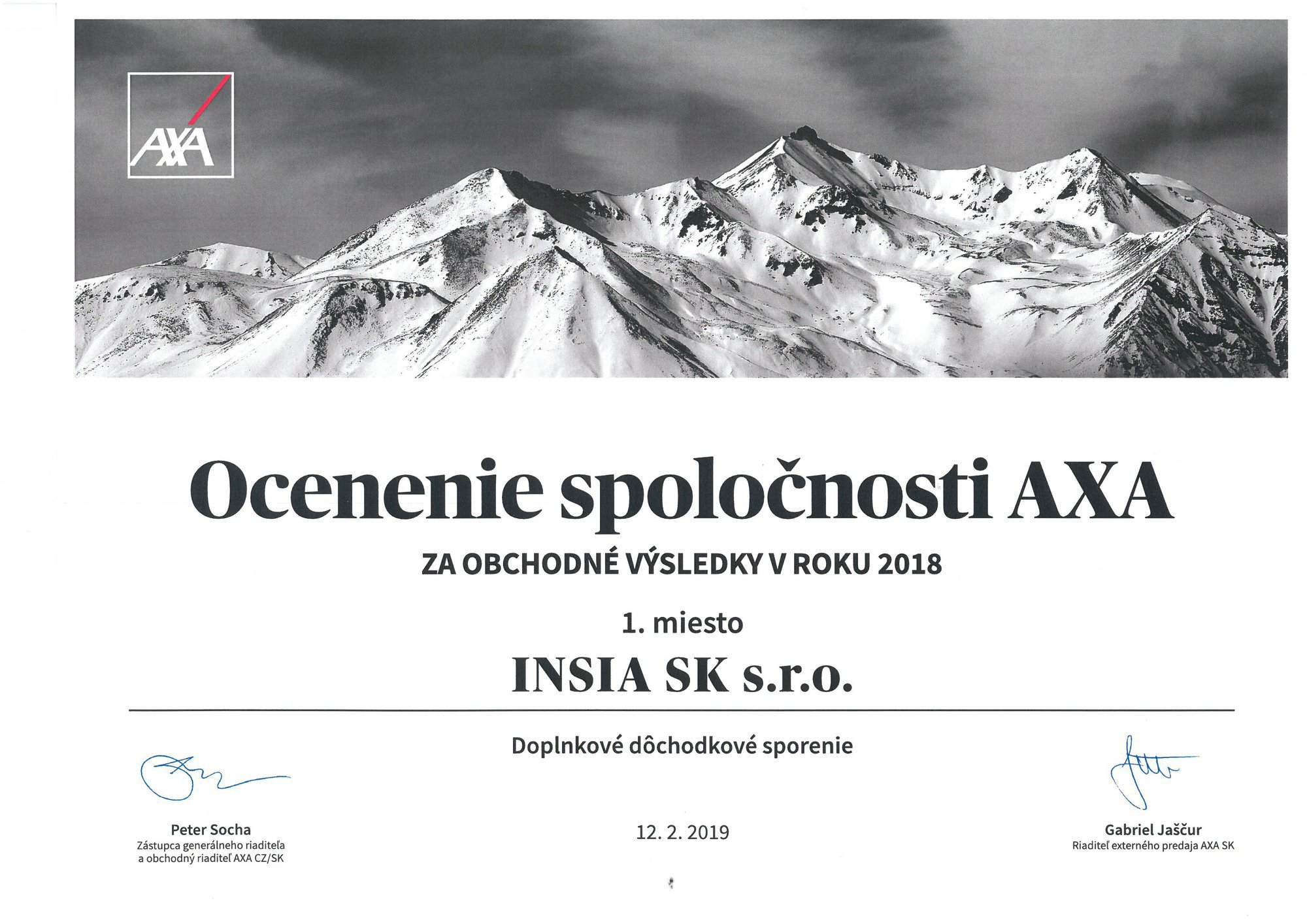 Za výborné produkčné výsledky dosiahnuté v roku 2018 v spoločnosti AXA získala INSIA SK ocenenie v dvoch kategóriách.