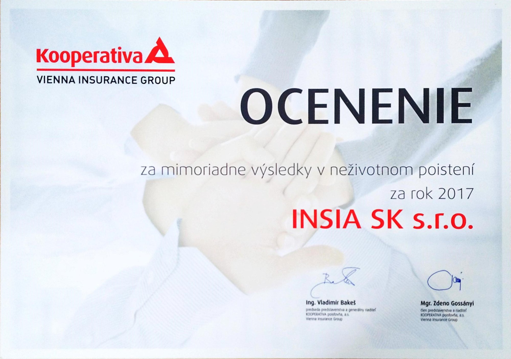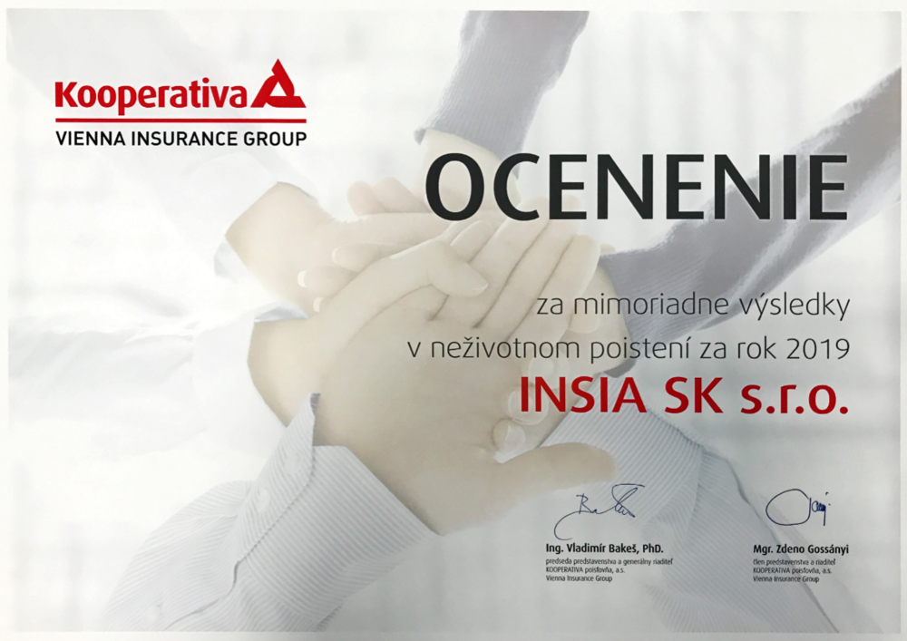 INSIA SK bola vyhodnotená KOOPERATIVA poisťovňou za mimoriadne výsledky v neživotnom poistení dosiahnuté v roku 2019.